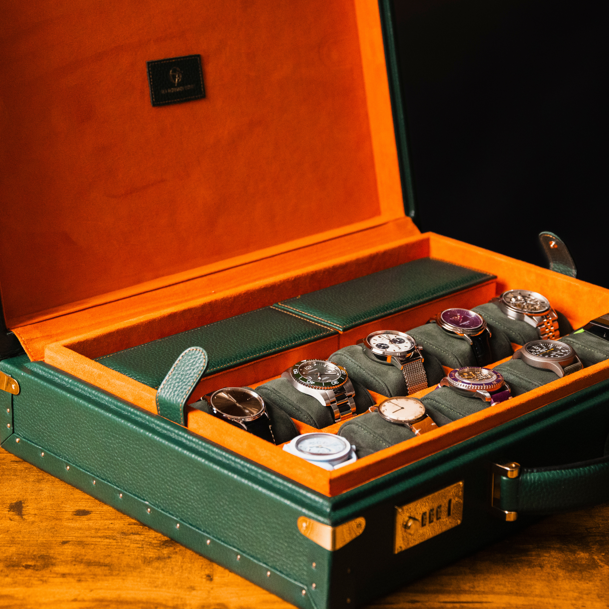Handcrafted in deep green leather with an orange suede interior, this watch case is designed for collectors who believe their timepieces deserve more than storage.